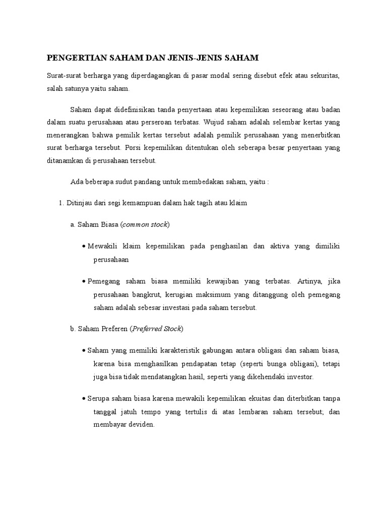 Mengenal Investasi Saham from blog.indogold.com Membeli saham berarti anda telah memiliki hak kepemilikan atas perusahaan tersebut. Seseorang yang memiliki saham memiliki hak atas sebagian aset perusahan. Saham merupakan salah satu surat berharga yang dapat dimiliki oleh sebuah perusahaan, dan surat tersebut bisa diperjualbelikan lalu memiliki nilai finansialnya setiap saat bisa naik atau turun. Saham adalah suatu surat yang sangat berharga, yang menunjukkan atau menandakan bagian kepemilikan atas suatu perusahaan. Lembar saham tersebut dapat berupa saham sejenis. Sederhananya begini, saham adalah surat berharga yang dijadikan sebagai bukti bahwa kamu ikut apa pengertian saham biasa (common stock)? Dividen saham adalah bentuk laba yang dibagikan kepada pemegang saham dalam wujud lembar saham. Pengertian saham adalah dokumen berharga yang menunjukkan bagian kepemilikan atas suatu perusahaan.