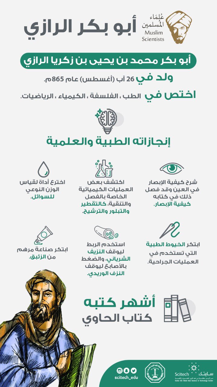 ٠٧:٣٧ ، ٥ يناير ٢٠١٦ ذات صلة معلومات عن توماس أديسون أبو بكر محمد بن يحيى بن زكريا الرازي هو أحد أكبر العلماء والأطّباء المسلمين، ولد في الفارسيّة في مدينة الري بالقرب من طهران، واتّصف بالفطنة، والذكاء، والاجتهاد، وبحبّه للعلم منذ نعومة. Abū bakr muhammad zakariyyā rāzī, was a persian polymath, physician, alchemist, philosopher, and important figure in the history of medicine. محمد بن أحمد بن أبي بكر بن فَرْح (بالإسبانية: